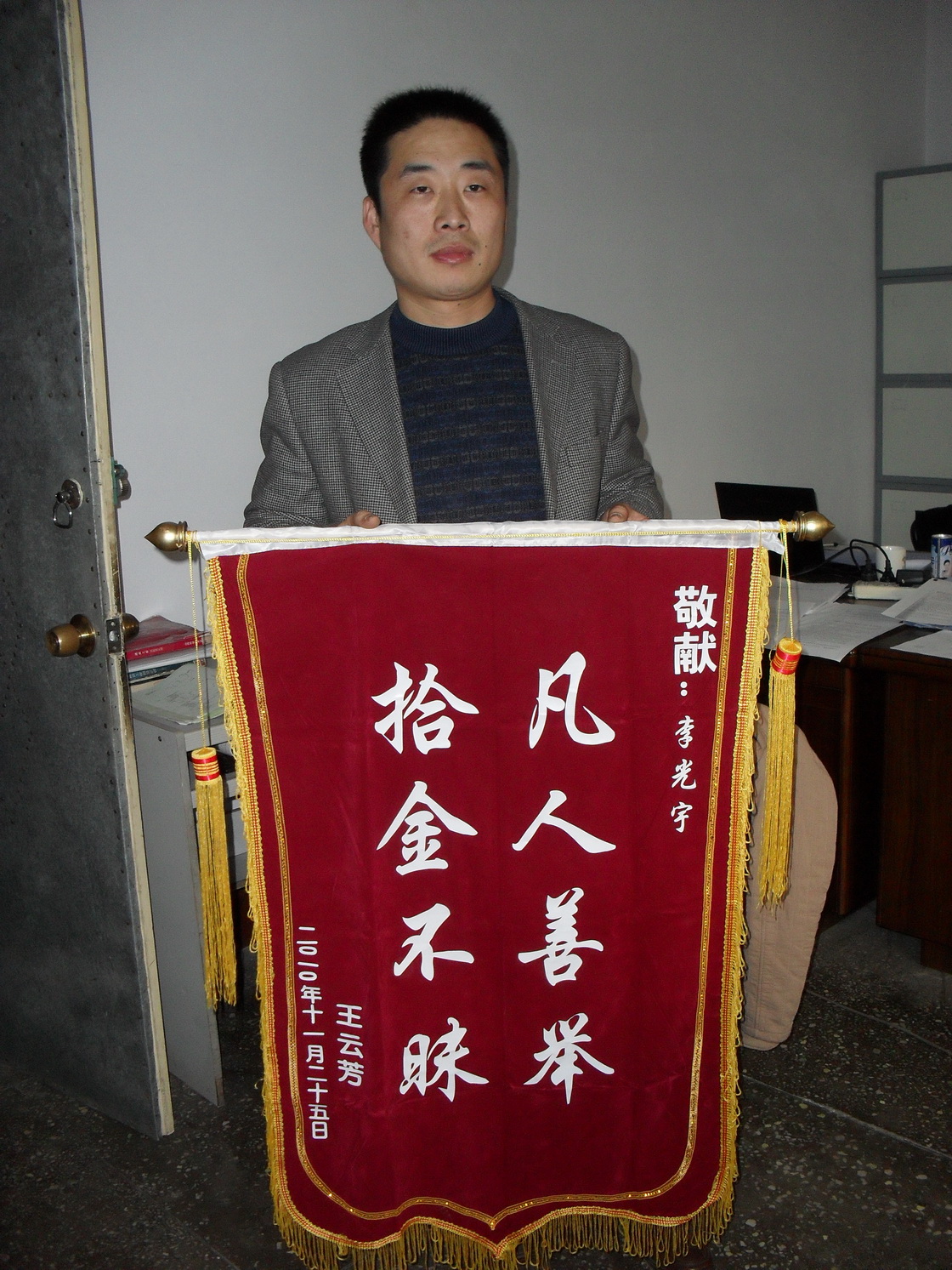 次日,為了再次對李光宇同志拾金不昧的事跡表示感謝,失主還千方百計的找到我公司的具體地址,并送上一面錦旗,我們對李光宇同志拾金 不昧的精神表示深深的敬意!